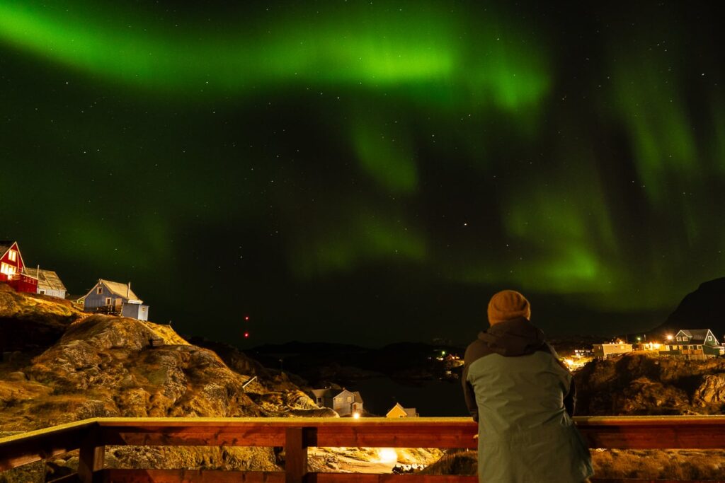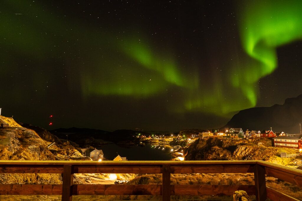 Jedno z klasických lákadel Arktidy je sledování polární záře. Parádní podívaná k vidění od konce srpna do začátku května. Když se zadaří, tak i z naší terasy uprostřed města si ji parádně užíváme.